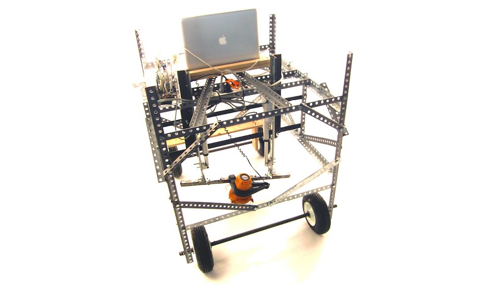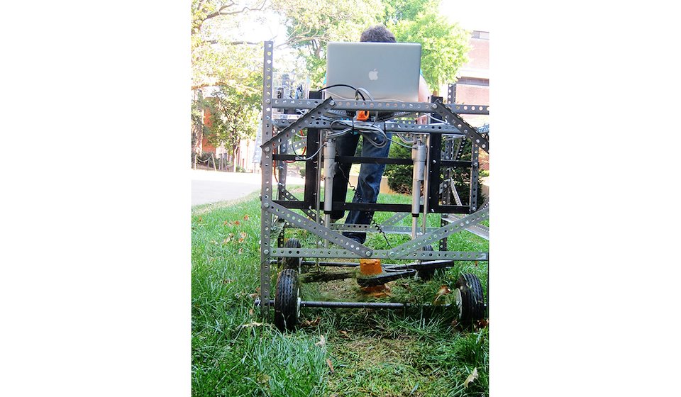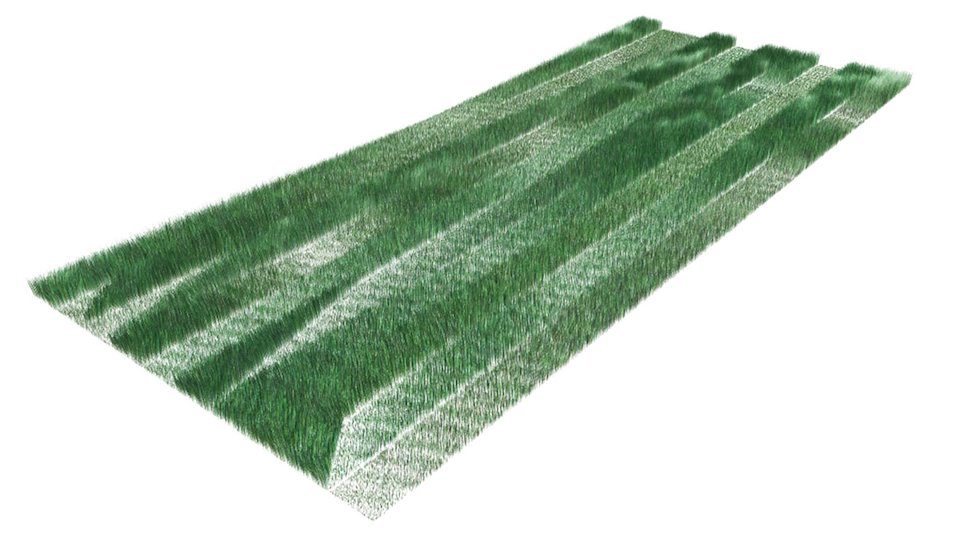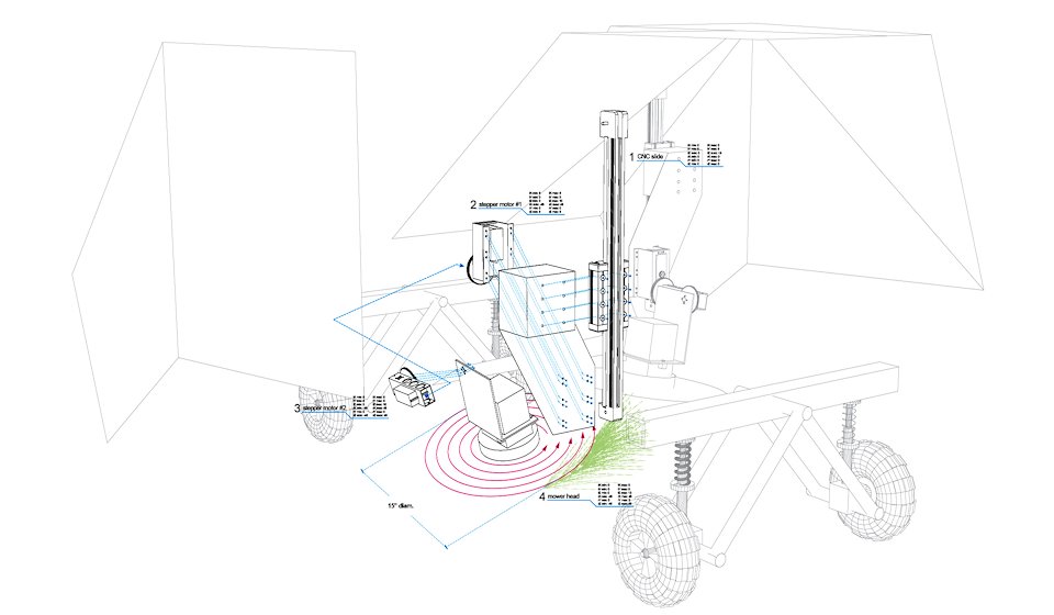 Field condition seeks to push the boundaries of fabrication methods by shaping a rapidly regenerating material: grass. By adjusting its height and angle over the course of the cut, the mower can cut 3d patterns over an infinitely scalable surface. This is possible because the cutting mechanism is pushed by a human operator who must read the onboard speed and heading data to coordinate the speed of the actuators. To achieve this a prototype was created that allowed digital patterns to be created and then “printed” into the grass. Unlike typical CNC cutting the material being shaped responds over time by re-growing and setting up an interactive and ongoing relationship with the person and machine trying to shape it.