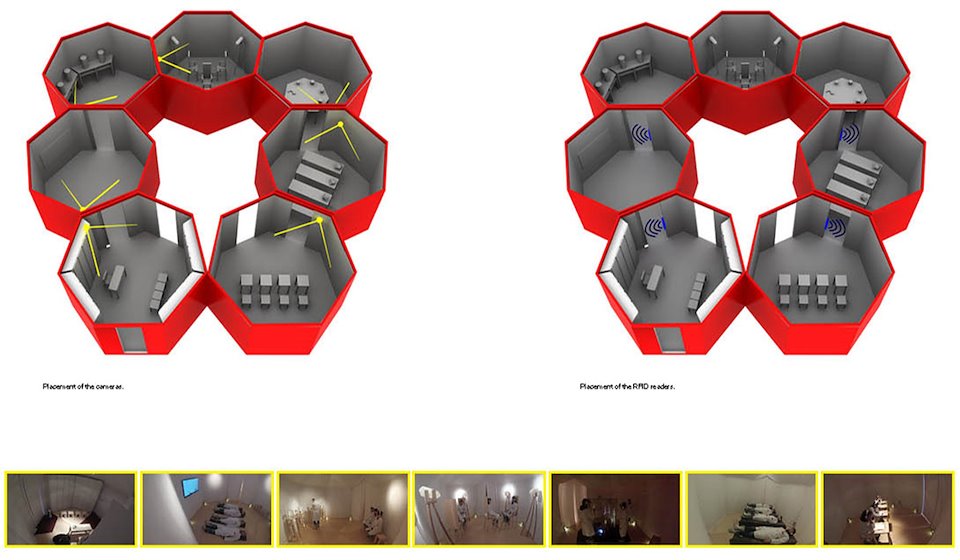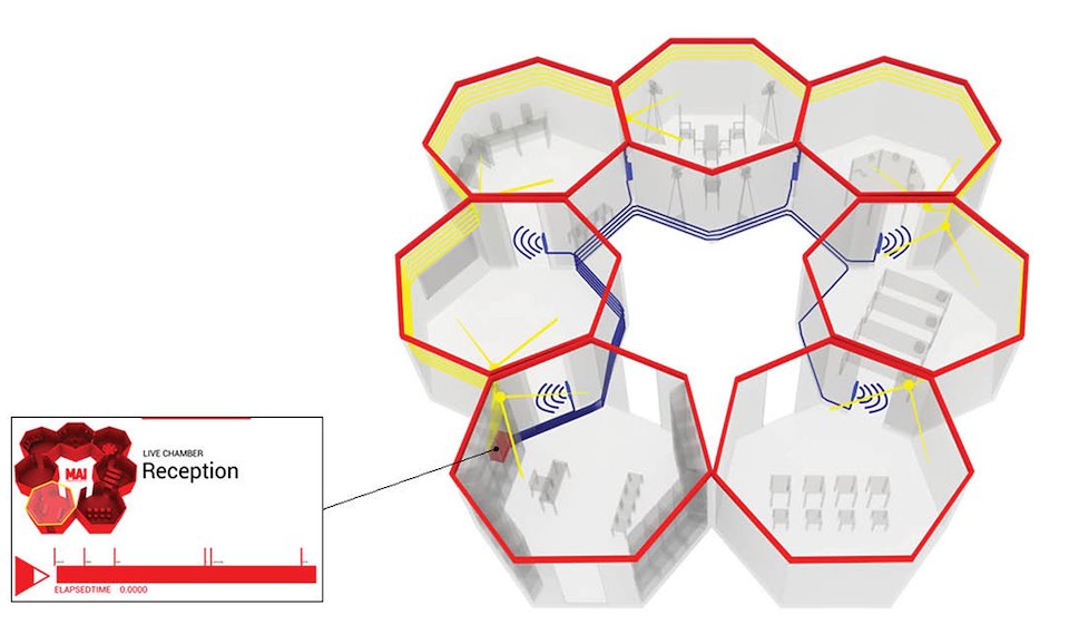Marina Abramovic’s MAI prototype represents a first test in the artist’s initiative to develop an institute where visitors can learn the techniques and ideas she has developed in the field of performance art. This mobile prototype consists of 7 connected chambers and an interior courtyard that visitors move through in groups of four. Guided by an audio track created by the artist, the visitors perform a specific set of actions in each of the chambers. Working with Abramovic, we created a system that tracked a specific group of people as they moved through the prototype. The video was streamed to a website and during the Luminato Festival, to an installation at Pearson Airport. The streaming setup used a network of high frequency RFID tags/readers, cameras, and custom controllers linked to a video switcher. As the tagged visitors moved into a specific space, the RFID readers trigger the corresponding camera to activate, creating a continuous stream of the group’s experience. This automated system created a continuous stream of the performance for 12 hours a day.