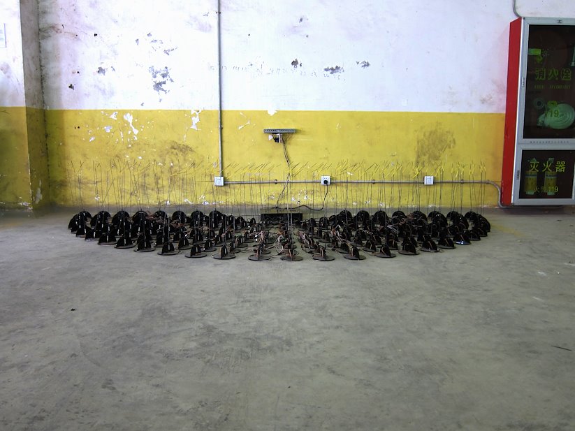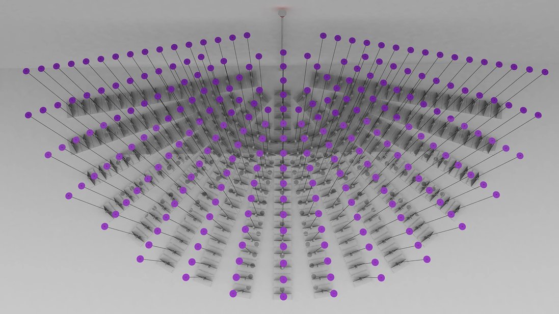 Pulse v1 scans and visualizes the shifting landscape of the exhibition as a field of vibrating antennae. A custom Lidar laser scanner is used to continually digitize the surrounding crowds, exhibits, and architecture to create a dynamic map of the space. With each scanning pass, these digital maps are translated into the movement of 250 robotic antennae, which vibrate in response to the current and historic activity in the space. Each radial line of antennae are activated only as the lidar intersects with them. The entire system operates at a very slow refresh rate of 0.15 Hz.