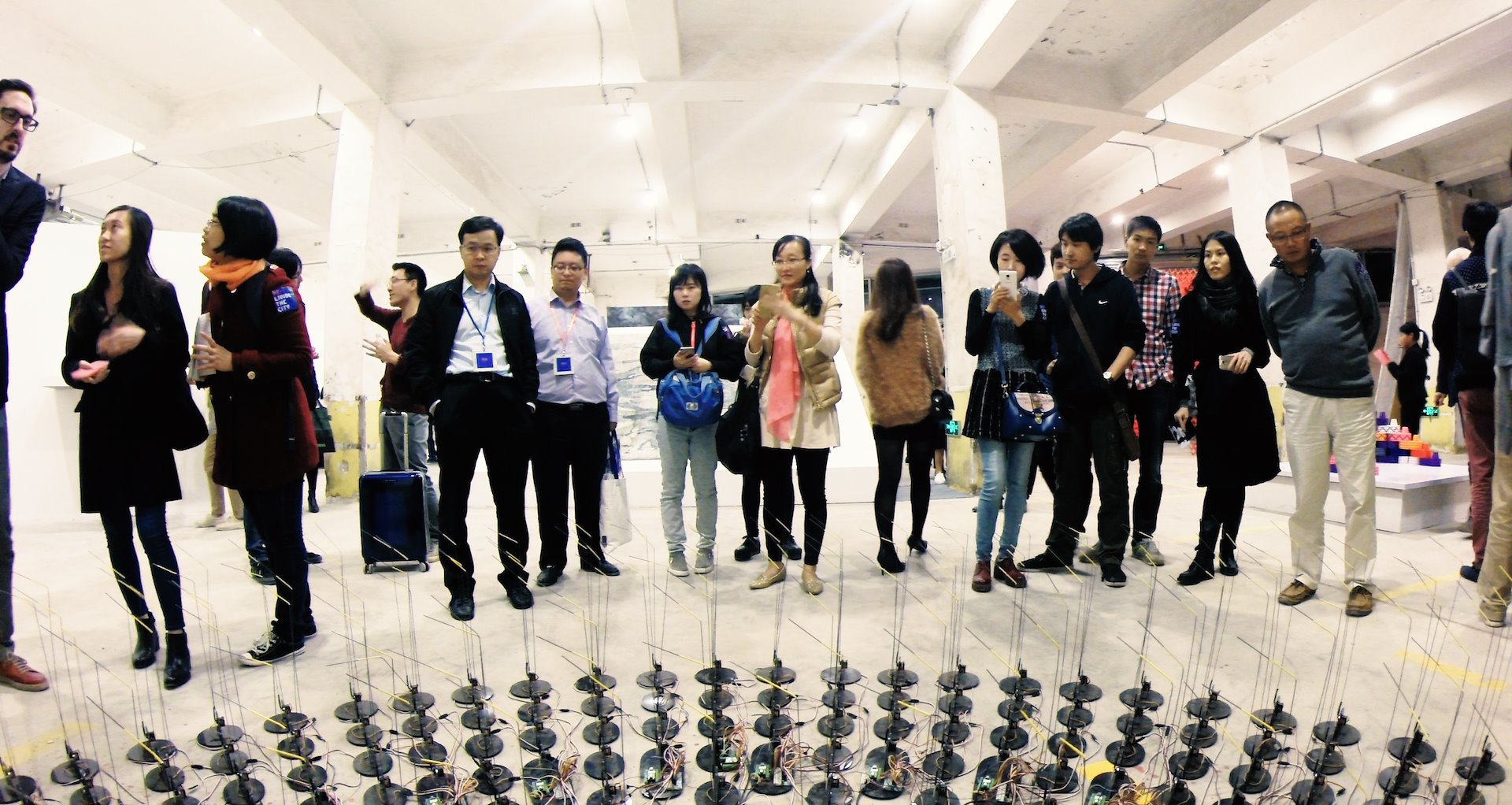 Over time, each antenna builds up an inertia that multiplies or resists the current activity within the exhibition based on patterns of occupation. This process operates continuously during the exhibition, providing visitors with a visualization of the current state of the exhibition space in relationship to its history.