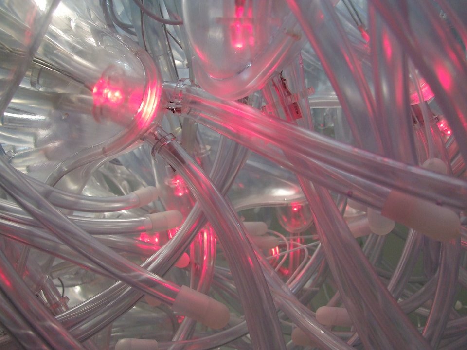 The basic variables in the system were Water + Nutrients + CO2. The CO2 was to be provided by the visitors by blowing into the tubes. The goal for the monitoring system was to track the amount of interaction (and thus CO2) units were receiving, save this to a database to compare to the other variables over time, and reflect this through the intensity of the LEDs. Units which received less CO2 glow brighter to attract attention from visitors to gain theri CO2. The LEDs also provided realtime feedback to users as to which units they were affecting.